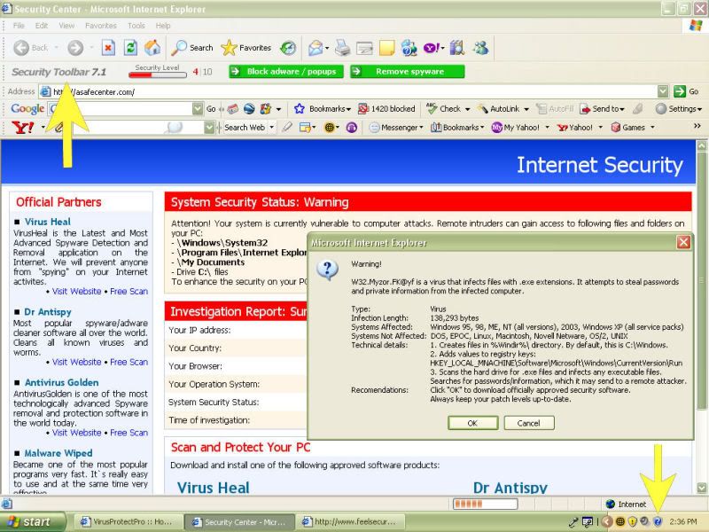 Here is what it is making my homepage. And with it is a WARNING box that pops up whenever I re-start my computer. The yellow arrow at the top shows the toolbar and then there is a little icon at the bottom of the screen.