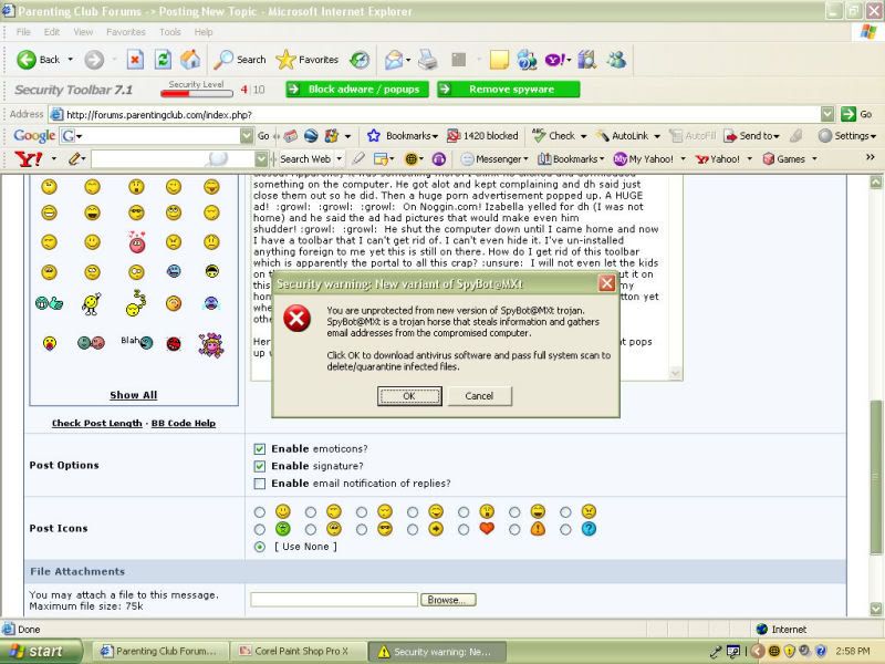 Crystalina wrote: Ok my kids were on the computer (noggin.com) and there was a pop-up that Evan closed. Apparently it was something more. I think he clicked and downloaded something on the computer. He got alot and kept complaining and dh said just close them out so he did. Then a huge porn advertisement popped up. A HUGE ad! On Noggin.com! Izabella yelled for dh (I was not home) and he said the ad had pictures that would make even him shudder! He shut the computer down until I came home and now I have a toolbar that I can't get rid of. I can't even hide it. I've un-installed anything foreign to me yet this is still on there. How do I get rid of this toolbar which is apparently the portal to all this crap? I will not even let the kids on the computer anymore. Last nigt I turned the moniter off and when I put it on this morning it was full of porn and ads for security stuff. I can't even get my homepage back. I keep going to MSNBC and clicking on the homepage button yet when I click my home button it takes me to a security something or other. If anyone can help I would appreciate it.