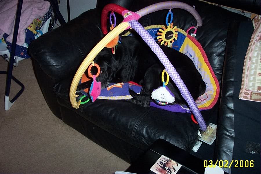 Gypsy made herself right at home on Annika's Gym thingy. What is it with animals taking over babies stuff.
